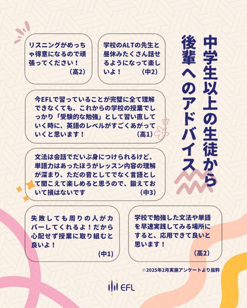 それはもちろん彼女だけではありません。他の中高生に後輩へのアドバイスとしてアンケートをとったものをご紹介いたします。